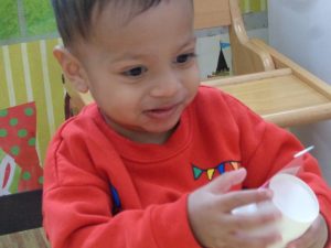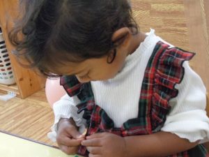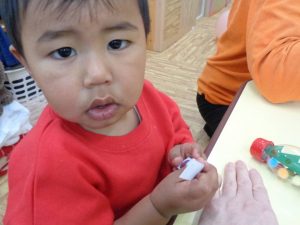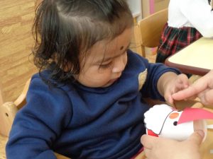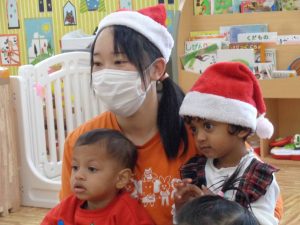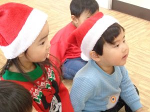 お子さま達が楽しみにしていたクリスマス会です。サンタの帽子を被り、手遊びやクリスマスの絵本を見たり、