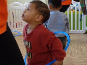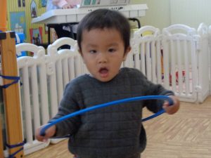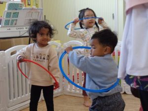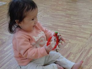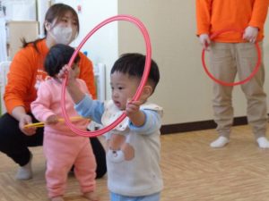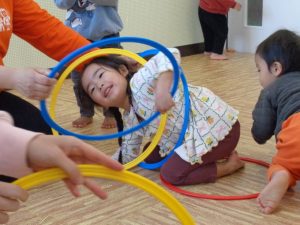 今年初めてのリトミックは輪や鈴を使って楽しみました