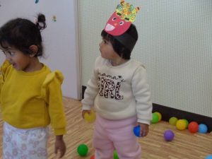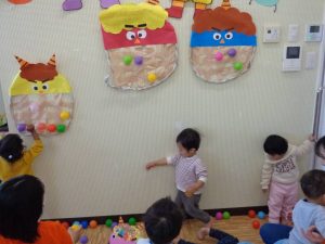 園でも、お子さま達が自分で作った鬼のお面をつけ、ボールを豆に見立てて元気よく豆まきを行いました。